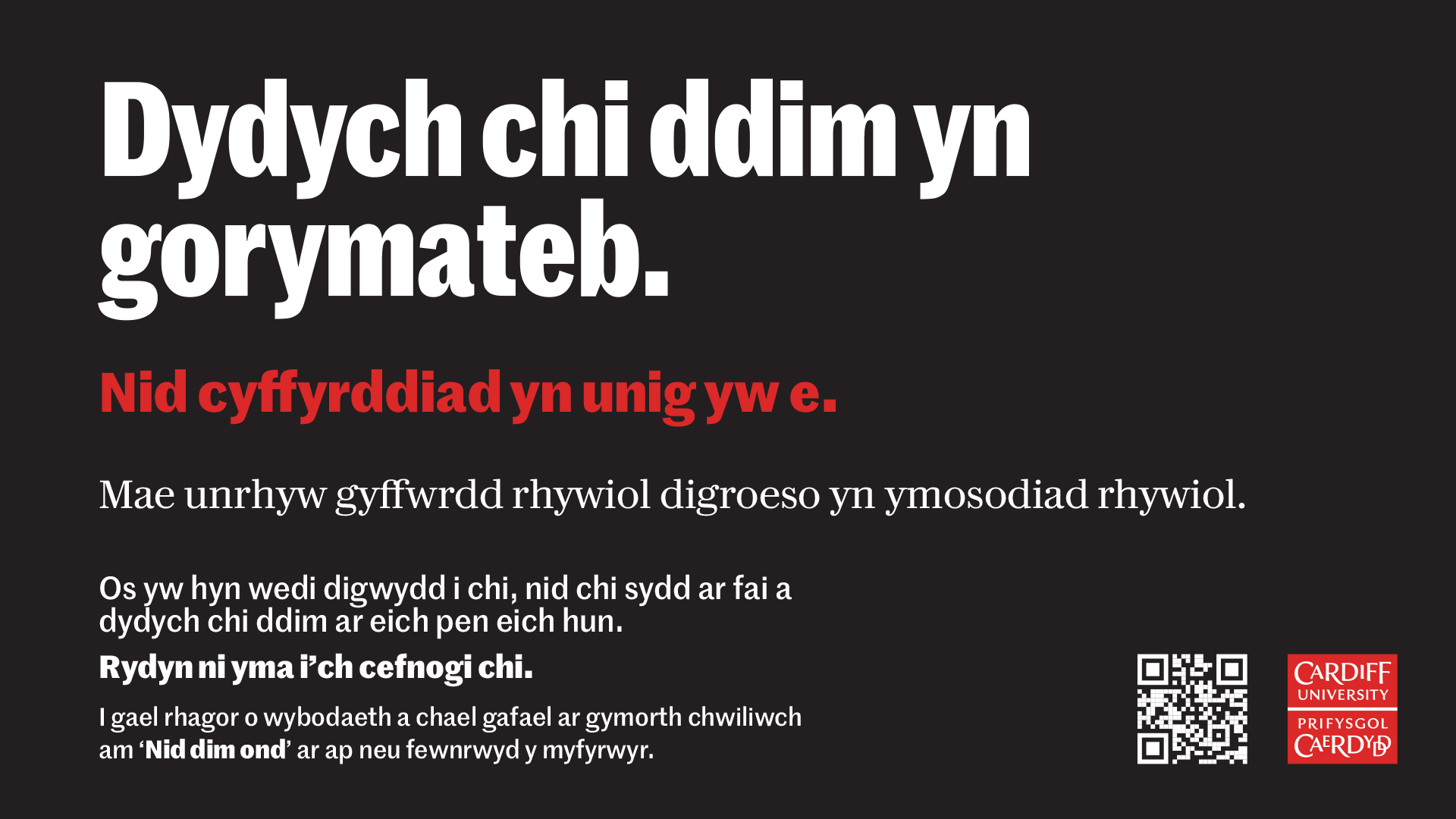 Rydyn ni wedi ymrwymo i greu amgylchedd diogel, parchus a chynhwysol i gymuned y Brifysgol. Ymunwch â ni am 16 Diwrnod o Weithredu wrth i ni dorri'r stigma ynghylch trais a cham-drin rhywiol, codi ymwybyddiaeth o gefnogaeth i bob rhywedd, a rhannu ffyrdd y gallwch chi weithredu.